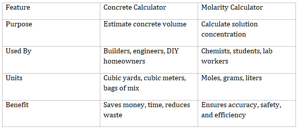 Both the concrete calculator and the molarity calculator are powerful tools designed to save time, reduce errors, and make complex calculations accessible to everyone. Whether you’re mixing cement for a new driveway or preparing a chemical solution in the lab, these calculators help you get it right the first time.
